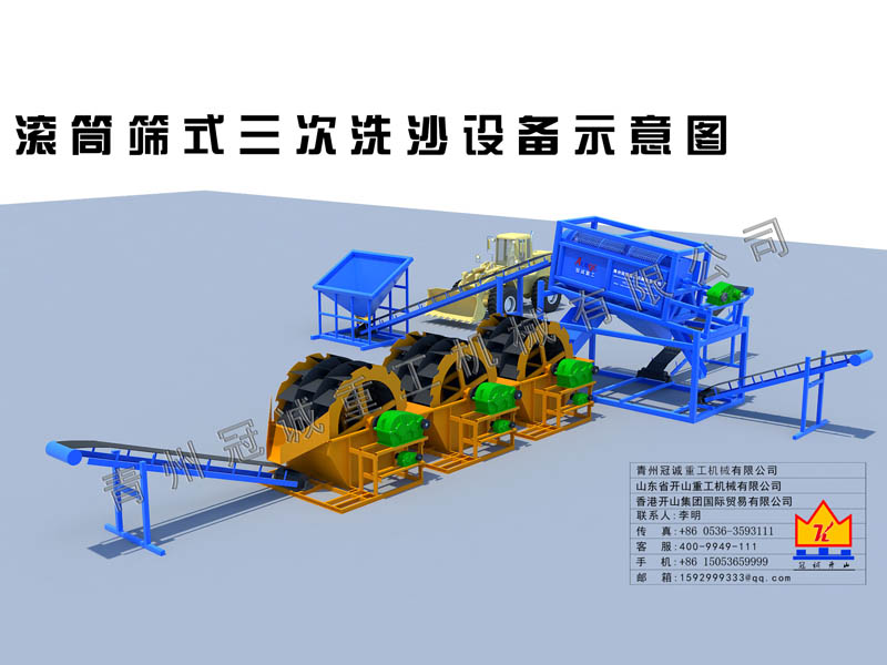 滾筒篩式三次洗沙洗石設備技術參數:設備占地總長度約25米